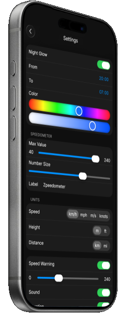 We tell you all the good GPS stuff in real time. Watch your speed analog and digital. See your altitude along with your heading . Track your whole distance and set highly customizable speed limits.